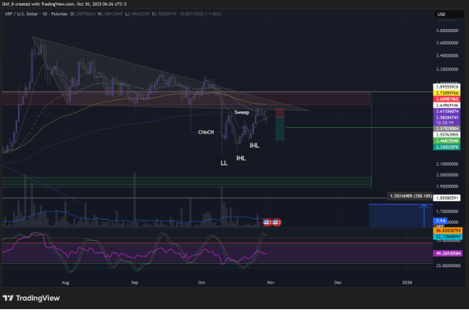 Meanwhile, another analysis flags that if XRP can’t hold above $2.50, the bullish inverse head-and-shoulders pattern would fail and the dip could extend further.  And then there’s the shocking call from CasiTrades, suggesting XRP could fall as low as ~$1.40 before reversing.