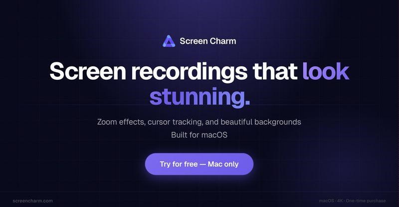 Screen Charm is a recording application for macOS screen that helps users create professional screen recordings through automatic zoom effects, smooth cursor tracking, webcam overlays, and a built-in editor. Designed for product teams, content creators, and educators.