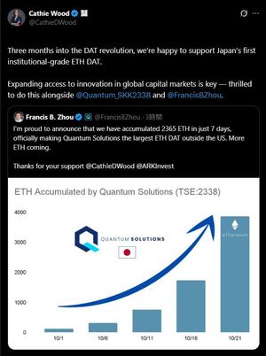 Tokyo, Japan, October 31, 2025 -- Tokyo Stock Exchange-listed Quantum Solutions Co., Ltd. (TSE: 2338) has officially become Asia’s largest institutional holder of Ethereum (ETH), marking a major milestone in digital asset adoption among public companies in the region. The announcement follows the accumulation of 2,365 ETH in just seven days, and has drawn public endorsement from ARK Invest CEO Cathie Wood, signaling growing international confidence in Quantum Solutions’ digital asset treasury (DAT) strategy and its leadership in Japan’s transition toward blockchain-based financial infrastructure.